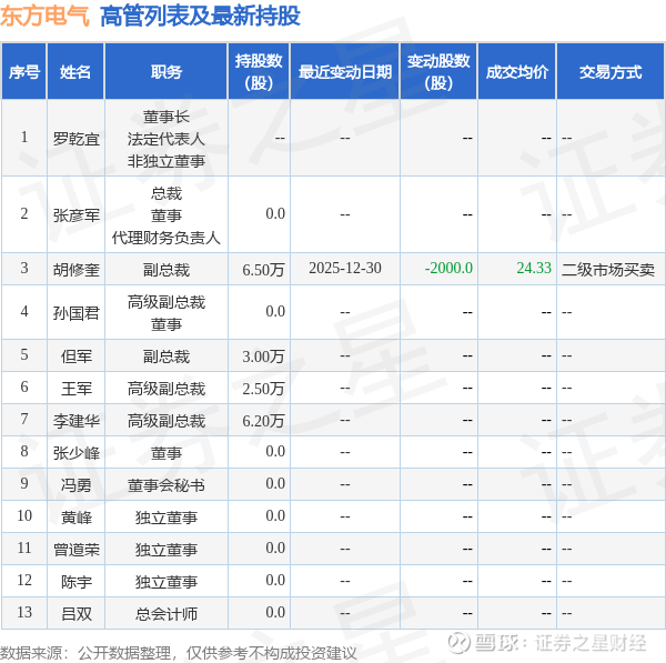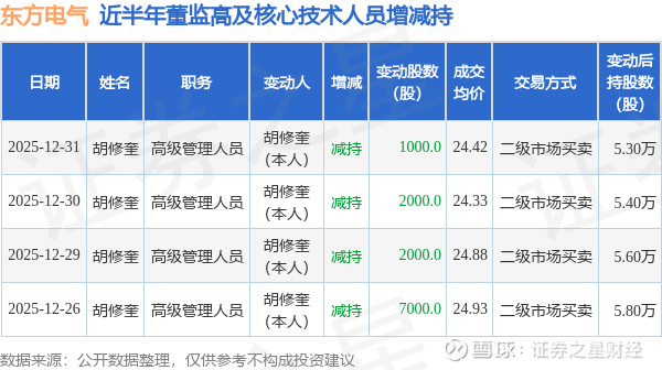证券之星消息,根据1月5日市场公开信息、上市公司公告及交易所披露数据整理,东方电气(600875)最新董监高及相关人员股份变动情况:2025年12月31日公司高级管理人员胡修奎共减持公司股份1000.0股,占公司总股本为0.0001%。变动期间公司股价下跌0.49%,12月31日当日收盘报24.28元。