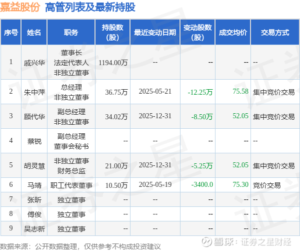 嘉益股份近半年内的董监高及核心技术人员增减持详情如下: