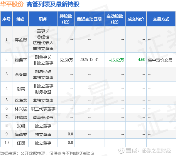 华平股份近半年内的董监高及核心技术人员增减持详情如下:
