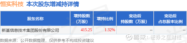 证券之星消息,1月5日恒实科技发布公告《恒实科技:详式权益变动报告书》,其股东新基信息技术集团股份有限公司于2025年10月15日至2025年10月17日间合计增持415.25万股,占公司目前总股本的1.3238%,变动期间该股股价下跌5.84%,截止10月17日收盘报9.36元。