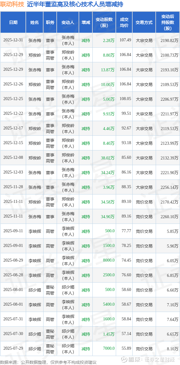 联动科技近半年内的董监高及核心技术人员增减持详情如下:
