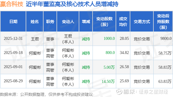证券之星消息,根据1月5日市场公开信息、上市公司公告及交易所披露数据整理,赢合科技(300457)最新董监高及相关人员股份变动情况:2025年12月31日公司董事王君共减持公司股份1000.0股,占公司总股本为0.0002%。变动期间公司股价上涨1.46%,12月31日当日收盘报27.85元。