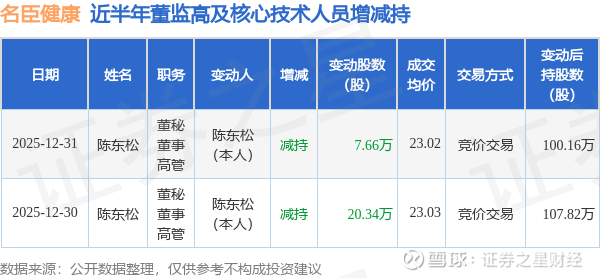 证券之星消息,根据1月5日市场公开信息、上市公司公告及交易所披露数据整理,名臣健康(002919)最新董监高及相关人员股份变动情况:2025年12月31日公司董秘,董事,高管陈东松共减持公司股份7.66万股,占公司总股本为0.0287%。变动期间公司股价上涨0.83%,12月31日当日收盘报22.99元。