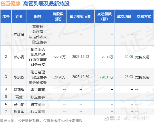 名臣健康的高管列表及最新持股情况如下: