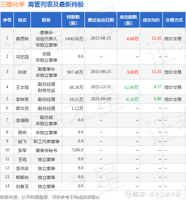 三维化学的高管列表及最新持股情况如下: