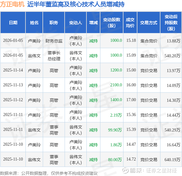方正电机近半年内的董监高及核心技术人员增减持详情如下: