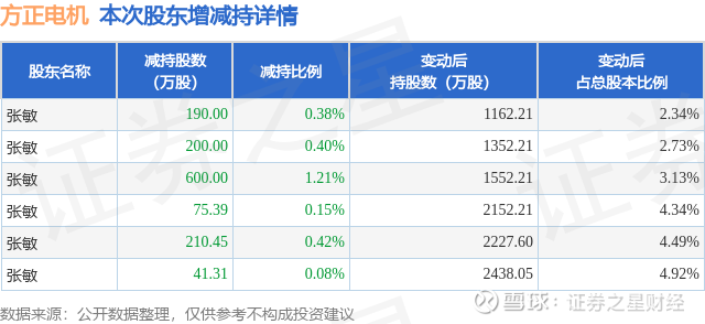 证券之星消息,1月5日方正电机发布公告《方正电机:关于原持股5%以上股东、部分董事及高级管理人员减持计划完成的公告》,其股东张敏于2025年11月20日至2025年12月31日间合计减持1317.15万股,占公司目前总股本的2.6562%,变动期间该股股价上涨15.92%,截止12月31日收盘报15.87元。
