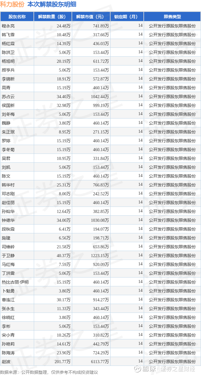 证券之星消息,根据市场公开信息整理,科力股份(920088)于1月6日将有763.13万股限售股份解禁,为公司公开发行原股东限售股份,占公司总股本8.66%。(本次数据根据历史公告整理得出,实际情况以上市公司最新公告为准)最近一年内,该股累计解禁420.0万股,占总股本的4.77%。本次解禁后,公司还有5629.02万股限售股份,占总股本63.91%。具体如下图所示:
