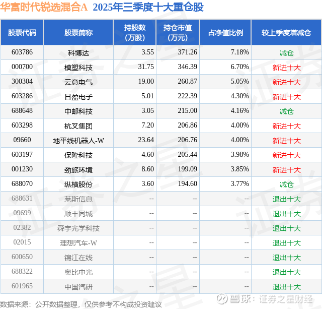 华富时代锐选混合A的前十大重仓股如下: