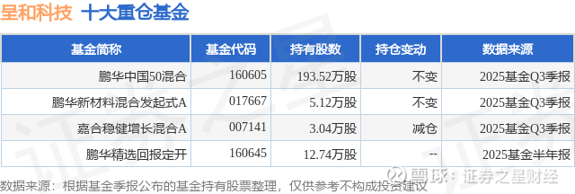 根据2025基金Q3季报公募基金重仓股数据,重仓该股的公募基金共3家,其中持有数量最多的公募基金为鹏华基金的鹏华中国50混合。鹏华中国50混合目前规模为13.56亿元,最新净值2.451(1月5日),较上一交易日上涨1.11%,近一年上涨44.43%。该公募基金现任基金经理为王云鹏。王云鹏在任的基金产品包括:鹏华新材料混合发起式A,管理时间为2023年3月28日至今,期间收益率为18.54%。