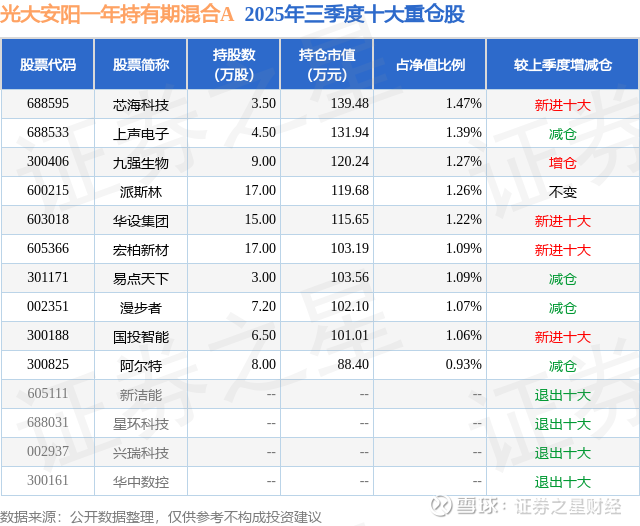 根据2025基金Q3季报公募基金重仓股数据,重仓该股的公募基金共1家,其中持有数量最多的公募基金为光大保德信基金的光大安阳一年持有期混合A。光大安阳一年持有期混合A目前规模为0.56亿元,最新净值1.142(1月5日),较上一交易日上涨0.55%,近一年上涨8.84%。该公募基金现任基金经理为黄波 华叶舒。黄波在任的基金产品包括:光大中高等级债券A,管理时间为2019年10月9日至今,期间收益率为68.96%;光大安祺债券A,管理时间为2019年10月9日至今,期间收益率为32.25%;光大增利收益债券A,管理时间为2019年10月9日至今,期间收益率为46.84%;光大信用添益债券A,管理时间为2019年10月9日至今,期间收益率为91.39%。华叶舒在任的基金产品包括:光大恒鑫混合A,管理时间为2022年9月17日至今,期间收益率为23.77%。