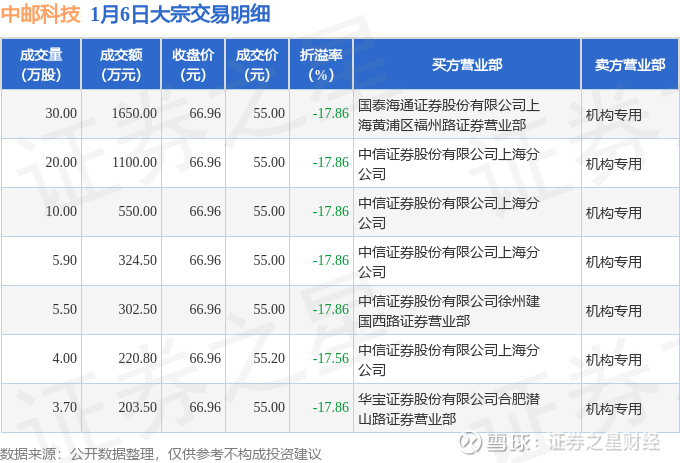 证券之星消息,1月6日中邮科技发生大宗交易,交易数据如下: