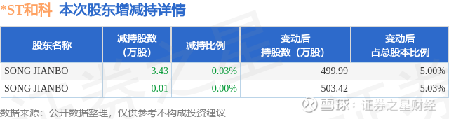 证券之星消息,1月6日*ST和科发布公告《*ST和科:关于持股5%以上股东减持至5%以下及权益变动触及1%整数倍暨披露简式权益变动报告书的提示性公告》,其股东SONG JIANBO于2025年11月14日至2026年1月5日间合计减持3.44万股,占公司目前总股本的0.0344%,变动期间该股股价上涨0.39%,截止1月5日收盘报23.19元。
