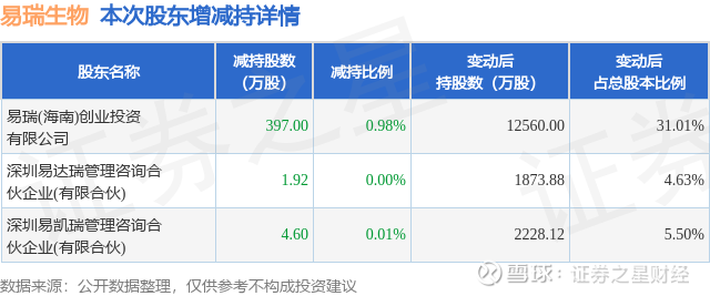 证券之星消息,1月6日易瑞生物发布公告《易瑞生物:关于控股股东及其一致行动人权益变动触及1%整数倍的提示性公告》,其股东易瑞(海南)创业投资有限公司、深圳易达瑞管理咨询合伙企业(有限合伙)、深圳易凯瑞管理咨询合伙企业(有限合伙)于2025年12月5日至2026年1月5日间合计减持403.52万股,占公司目前总股本的0.9962%,变动期间该股股价下跌0.91%,截止1月5日收盘报9.81元。