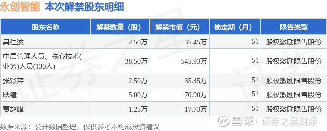 证券之星消息,根据市场公开信息整理,永创智能(603901)于1月7日将有49.75万股限售股份解禁,为公司股权激励限售股份,占公司总股本0.1%。(本次数据根据历史公告整理得出,实际情况以上市公司最新公告为准)最近一年内,该股累计解禁144.42万股,占总股本的0.29%。本次解禁后,公司还有989.64万股限售股份,占总股本1.99%。具体如下图所示:
