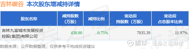 证券之星消息,1月7日吉林碳谷发布公告《吉林碳谷:持股5%以上股东权益变动达到1%的提示性公告》,其股东吉林九富城市发展投资控股(集团)有限公司于2025年12月31日至2026年1月6日间合计减持438.0万股,占公司目前总股本的0.7453%,变动期间该股股价下跌3.78%,截止1月6日收盘报17.06元。