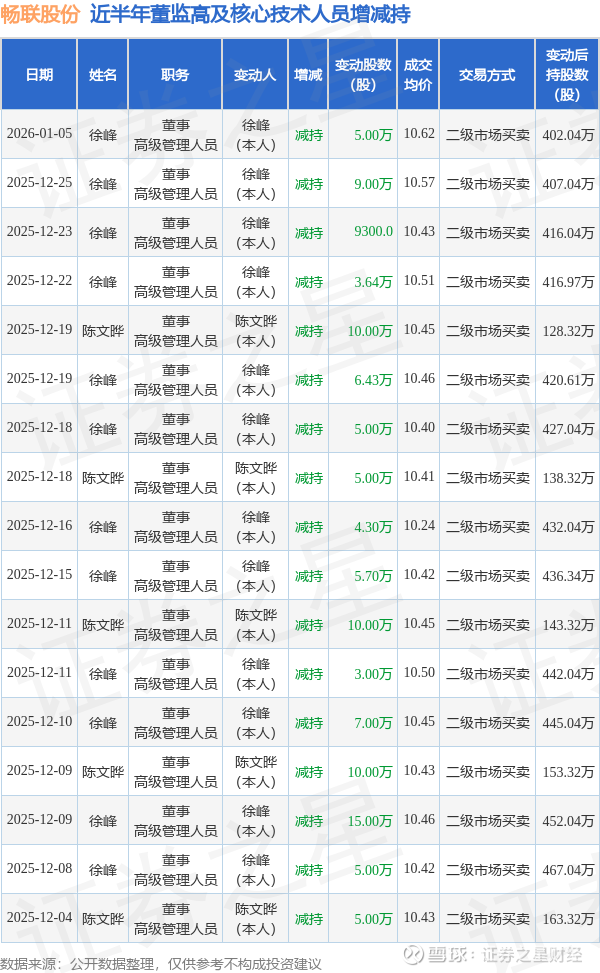 畅联股份近半年内的董监高及核心技术人员增减持详情如下:
