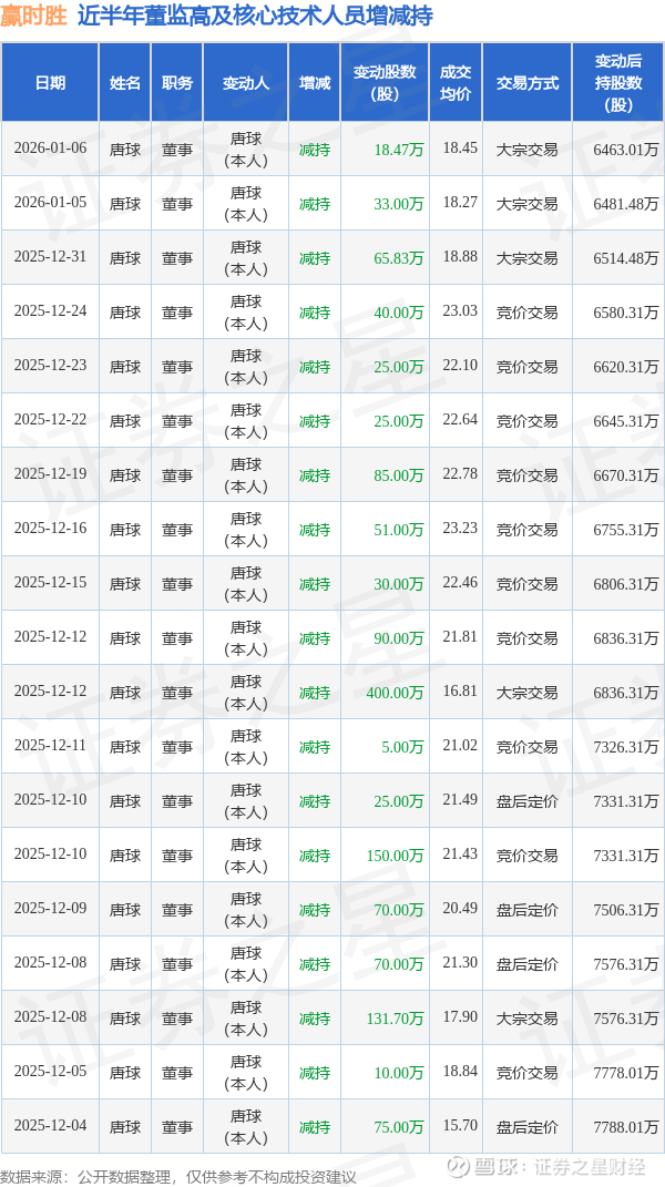 赢时胜近半年内的董监高及核心技术人员增减持详情如下: