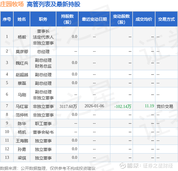 庄园牧场的高管列表及最新持股情况如下: