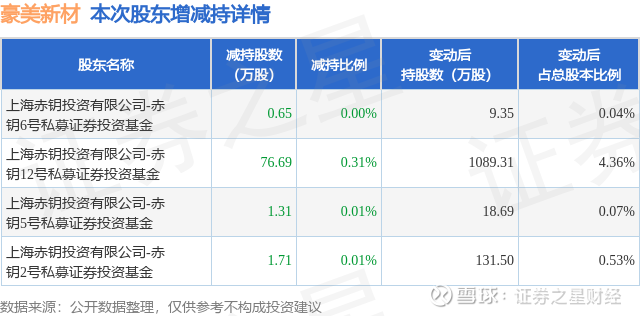 证券之星消息,1月7日豪美新材发布公告《豪美新材:关于持股5%以上股东减持公司股份至5%以下暨权益变动的提示性公告》,其股东上海赤钥投资有限公司-赤钥6号私募证券投资基金、上海赤钥投资有限公司-赤钥12号私募证券投资基金、上海赤钥投资有限公司-赤钥5号私募证券投资基金、上海赤钥投资有限公司-赤钥2号私募证券投资基金于2026年1月5日至2026年1月7日间合计减持80.36万股,占公司目前总股本的0.3216%,变动期间该股股价上涨6.2%,截止1月7日收盘报39.08元。