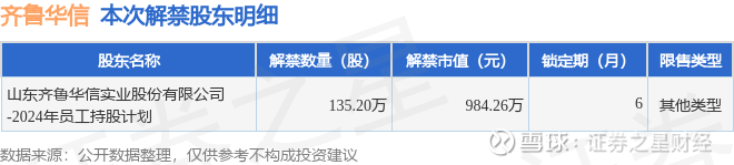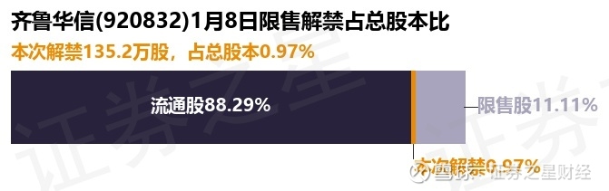 证券之星消息,根据市场公开信息整理,齐鲁华信(920832)于1月8日将有135.2万股限售股份解禁,为公司其他类型,占公司总股本0.97%。(本次数据根据历史公告整理得出,实际情况以上市公司最新公告为准)本次解禁后,公司还有1542.23万股限售股份,占总股本11.11%。具体如下图所示: