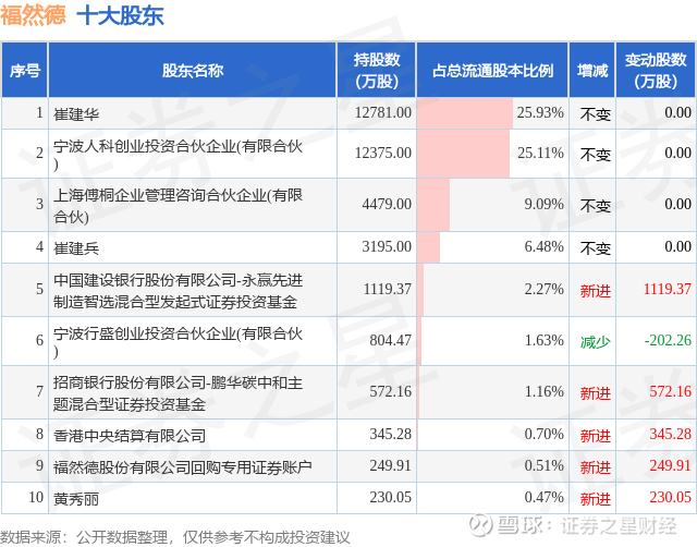 证券之星消息,1月8日福然德发布公告《福然德:福然德股份有限公司关于控股股东、实际控制人的一致行动人暨持股5%以上股东减持股份结果公告》,其股东宁波人科创业投资合伙企业(有限合伙)于2026年1月1日至2026年1月8日间合计减持233.08万股,占公司目前总股本的0.4729%,变动期间该股股价上涨1.48%,截止1月8日收盘报13.67元。