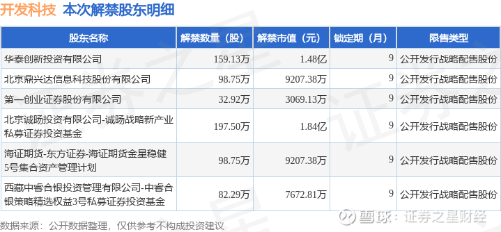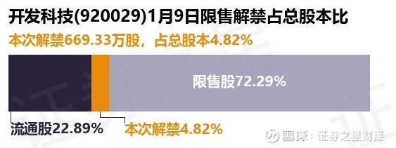 证券之星消息,根据市场公开信息整理,开发科技(920029)于1月9日将有669.33万股限售股份解禁,为公司公开发行战略配售股份,占公司总股本4.82%。(本次数据根据历史公告整理得出,实际情况以上市公司最新公告为准)本次解禁后,公司还有1.0亿股限售股份,占总股本72.29%。具体如下图所示: