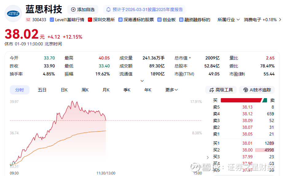 1月9日,蓝思科技A股盘中大涨,一度涨超18%。截至午间收盘,报38.02元/股,涨幅12.15%,换手率4.85%,成交额89.30亿元。