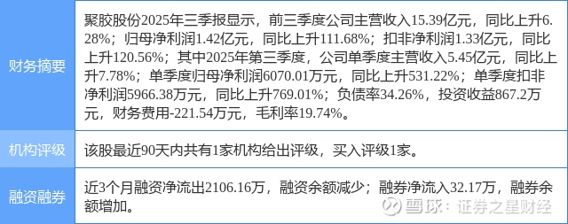 2025年10月29日,山西证券研究员李旋坤,王金源发布了对聚胶股份的研报《全球渗透率稳步提升,25Q3业绩再创新高》,该研报对聚胶股份给出“买入”评级。研报中预计公司2025-2027年归母净利分别为2.2/2.8/3.3亿元,对应PE分别为18/14/12X,维持“买入-B”评级。证券之星数据中心根据近三年发布的研报数据计算,该研报作者对此股的盈利预测准确度为49.29%。