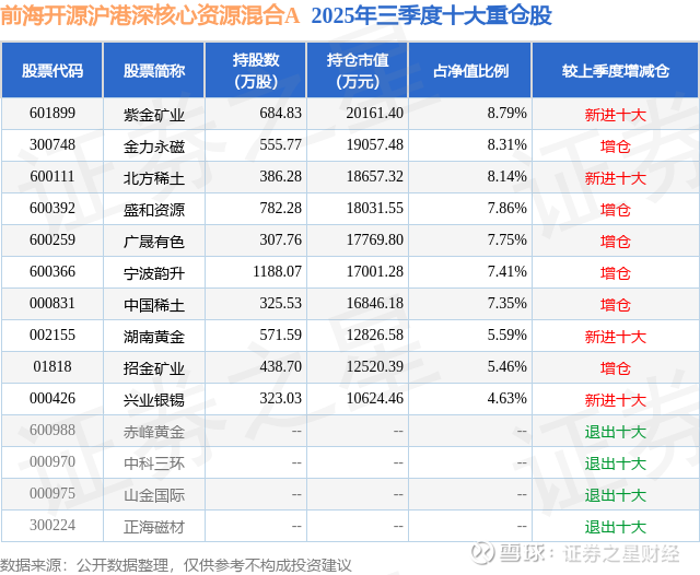 前海开源沪港深核心资源混合A的前十大重仓股如下: