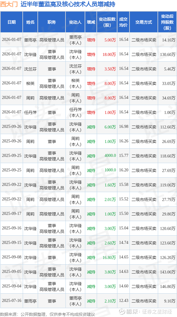 西大门近半年内的董监高及核心技术人员增减持详情如下:
