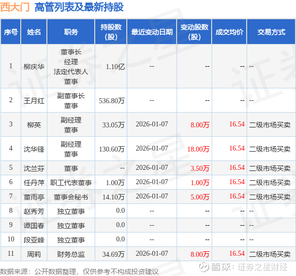 西大门的高管列表及最新持股情况如下:
