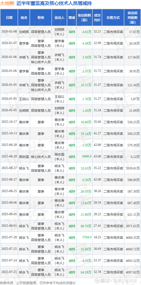 大地熊近半年内的董监高及核心技术人员增减持详情如下: