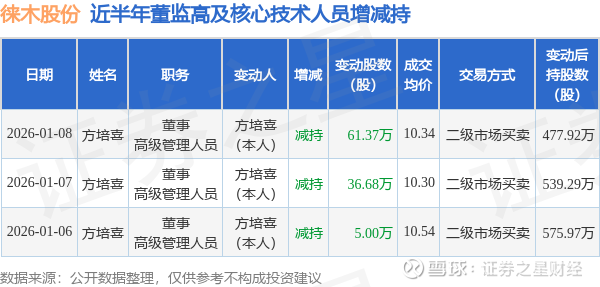 证券之星消息,根据1月9日市场公开信息、上市公司公告及交易所披露数据整理,徕木股份(603633)最新董监高及相关人员股份变动情况:2026年1月8日公司董事,高级管理人员方培喜共减持公司股份61.37万股,占公司总股本为0.1438%。变动期间公司股价上涨0.0%,1月8日当日收盘报10.28元。