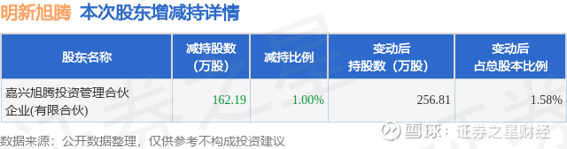 证券之星消息,1月9日明新旭腾发布公告《明新旭腾:明新旭腾关于控股股东、实际控制人的一致行动人权益变动触及1%刻度的提示性公告》,其股东嘉兴旭腾投资管理合伙企业(有限合伙)于2026年1月6日至2026年1月9日间合计减持162.19万股,占公司目前总股本的0.9999%,变动期间该股股价上涨2.52%,截止1月9日收盘报26.47元。