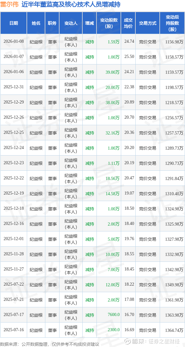 雷尔伟近半年内的董监高及核心技术人员增减持详情如下: