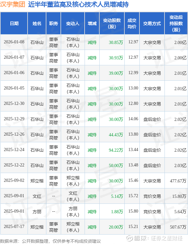 汉宇集团近半年内的董监高及核心技术人员增减持详情如下: