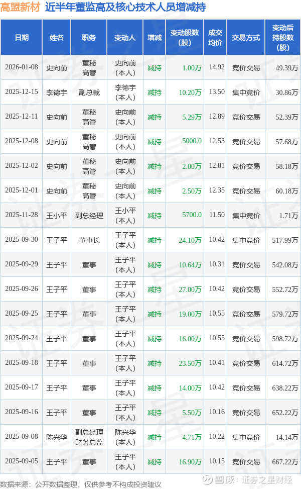 高盟新材近半年内的董监高及核心技术人员增减持详情如下: