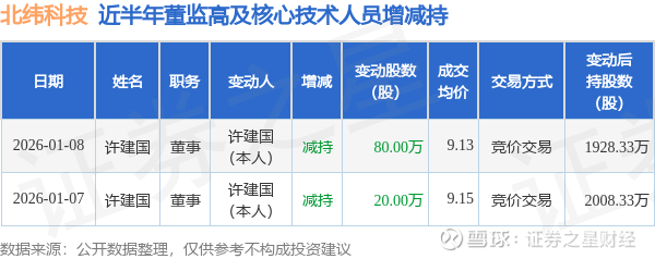 北纬科技近半年内的董监高及核心技术人员增减持详情如下: