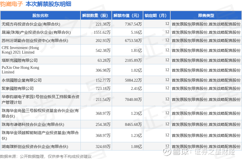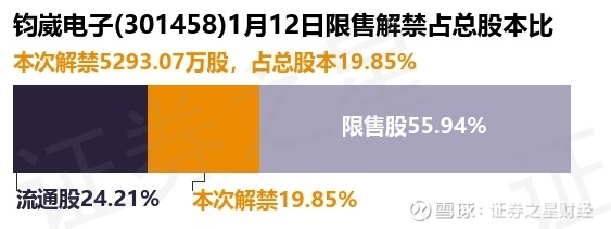 证券之星消息,根据市场公开信息整理,钧崴电子(301458)于1月12日将有5293.07万股限售股份解禁,为公司首发原股东限售股份,首发战略配售股份,占公司总股本19.85%。(本次数据根据历史公告整理得出,实际情况以上市公司最新公告为准)最近一年内,该股累计解禁346.63万股,占总股本的1.3%。本次解禁后,公司还有1.49亿股限售股份,占总股本55.94%。具体如下图所示: