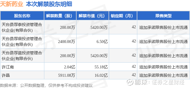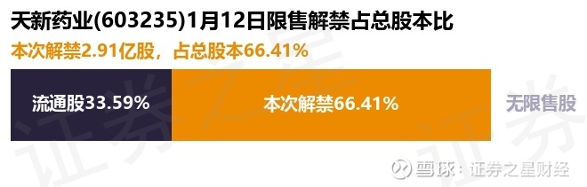 证券之星消息,根据市场公开信息整理,天新药业(603235)于1月12日将有2.91亿股限售股份解禁,为公司追加承诺限售股份上市流通,占公司总股本66.41%。(本次数据根据历史公告整理得出,实际情况以上市公司最新公告为准)本次解禁后,公司已无限售股份。具体如下图所示: