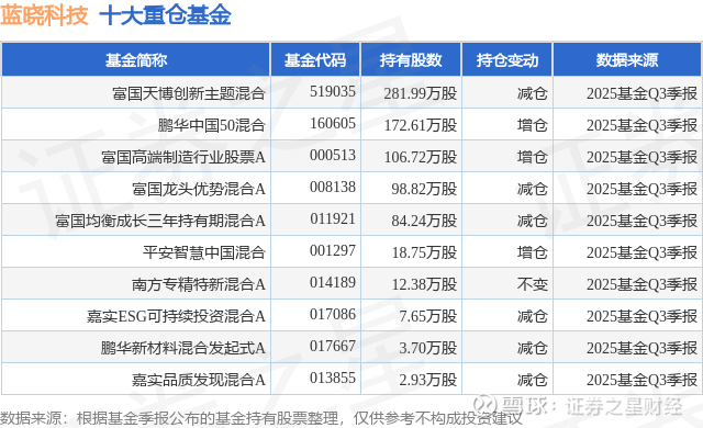 根据2025基金Q3季报公募基金重仓股数据,重仓该股的公募基金共13家,其中持有数量最多的公募基金为富国基金的富国天博创新主题混合。富国天博创新主题混合目前规模为16.96亿元,最新净值2.386(1月9日),较上一交易日上涨2.34%,近一年上涨52.96%。该公募基金现任基金经理为毕天宇。毕天宇在任的基金产品包括:富国高端制造行业股票A,管理时间为2014年6月20日至今,期间收益率为342.6%;富国龙头优势混合A,管理时间为2020年1月14日至今,期间收益率为58.57%;富国均衡成长三年持有期混合A,管理时间为2021年9月16日至今,期间收益率为0.98%。