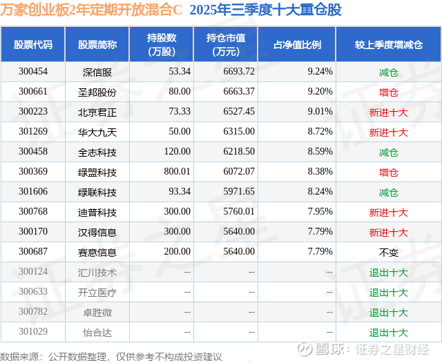 万家创业板2年定期开放混合C的前十大重仓股如下: