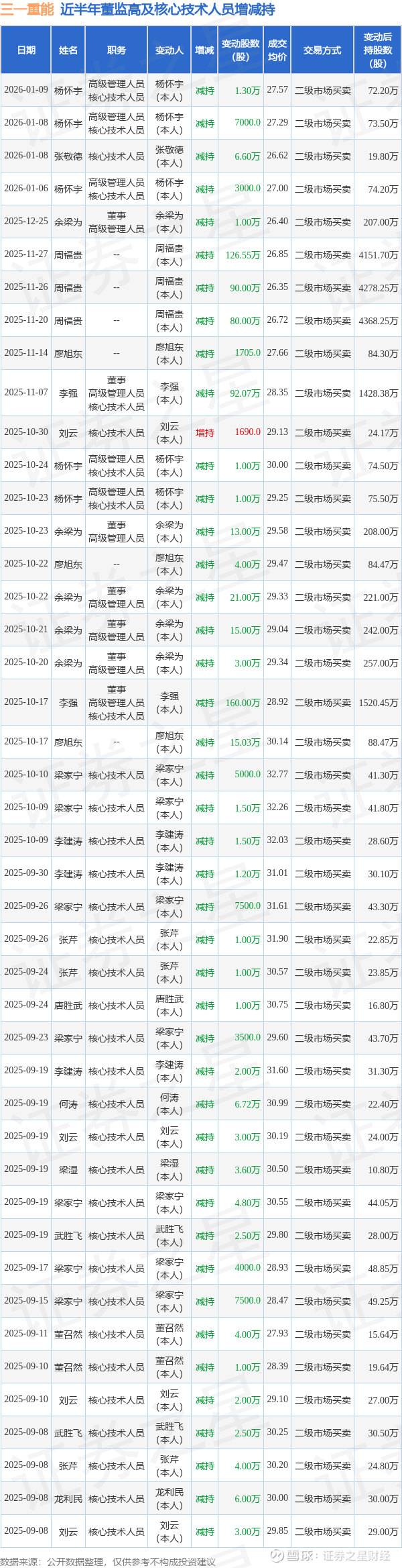 三一重能近半年内的董监高及核心技术人员增减持详情如下: