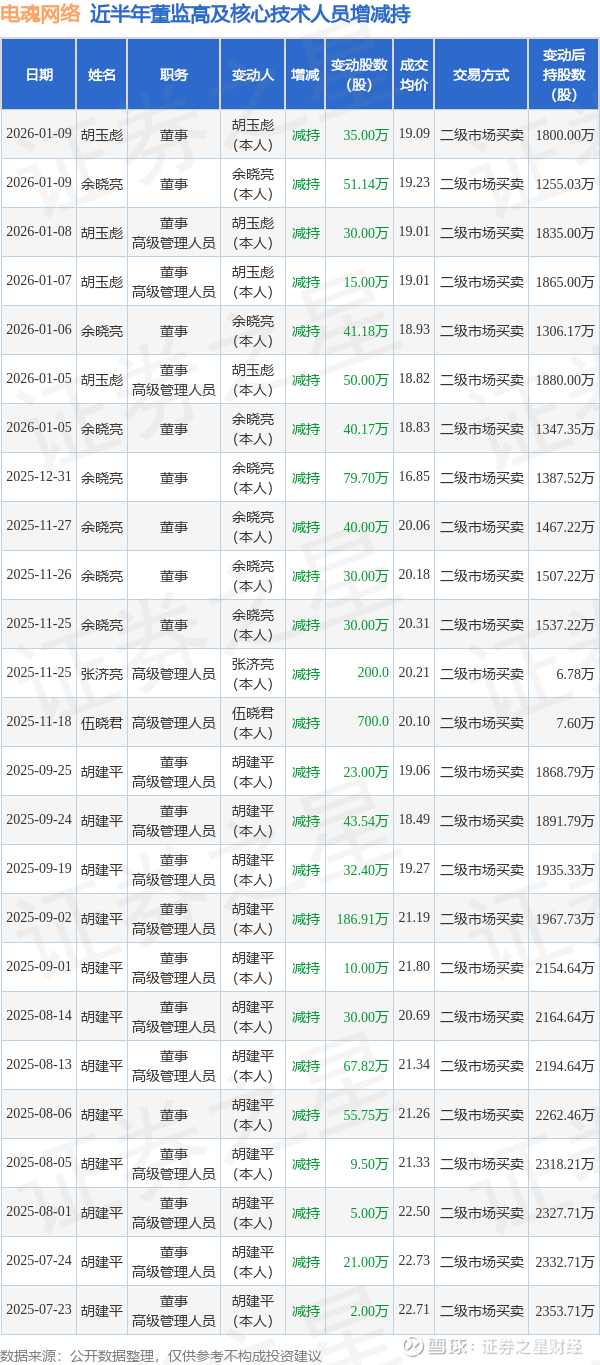 电魂网络近半年内的董监高及核心技术人员增减持详情如下: