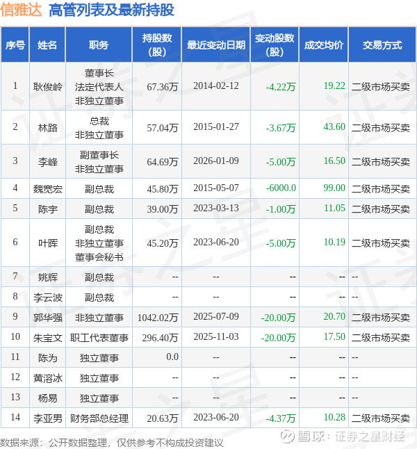 信雅达的高管列表及最新持股情况如下: