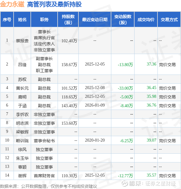 金力永磁近半年内的董监高及核心技术人员增减持详情如下: