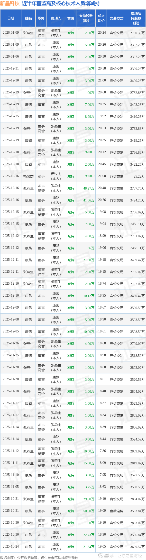 新晨科技近半年内的董监高及核心技术人员增减持详情如下: