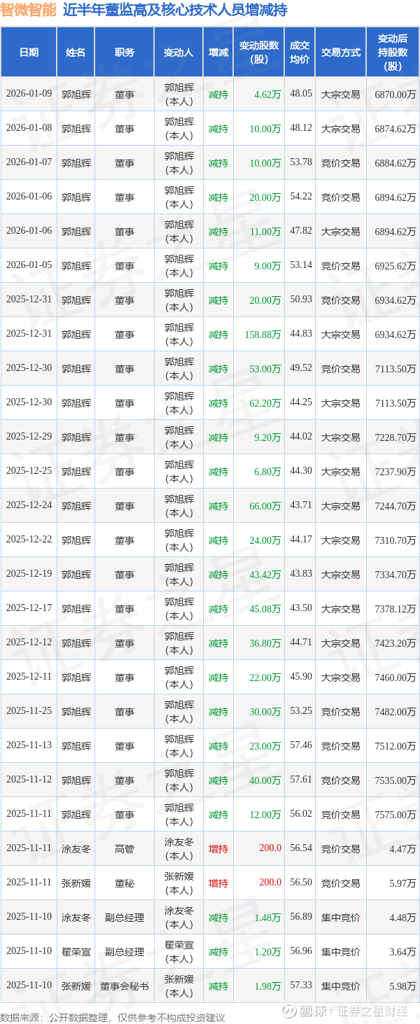 智微智能近半年内的董监高及核心技术人员增减持详情如下: