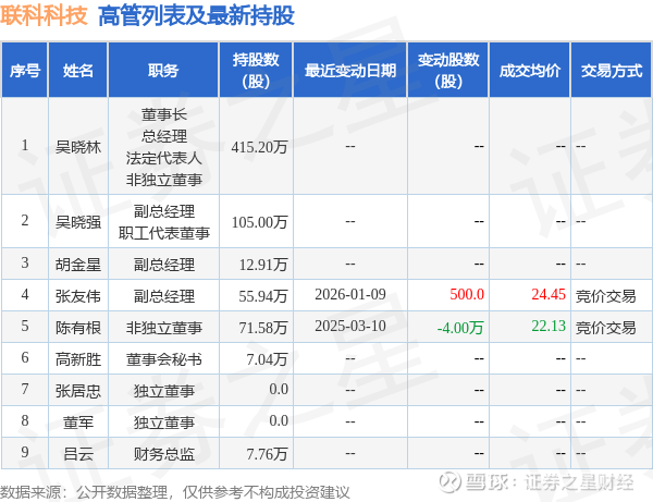 联科科技近半年内的董监高及核心技术人员增减持详情如下: